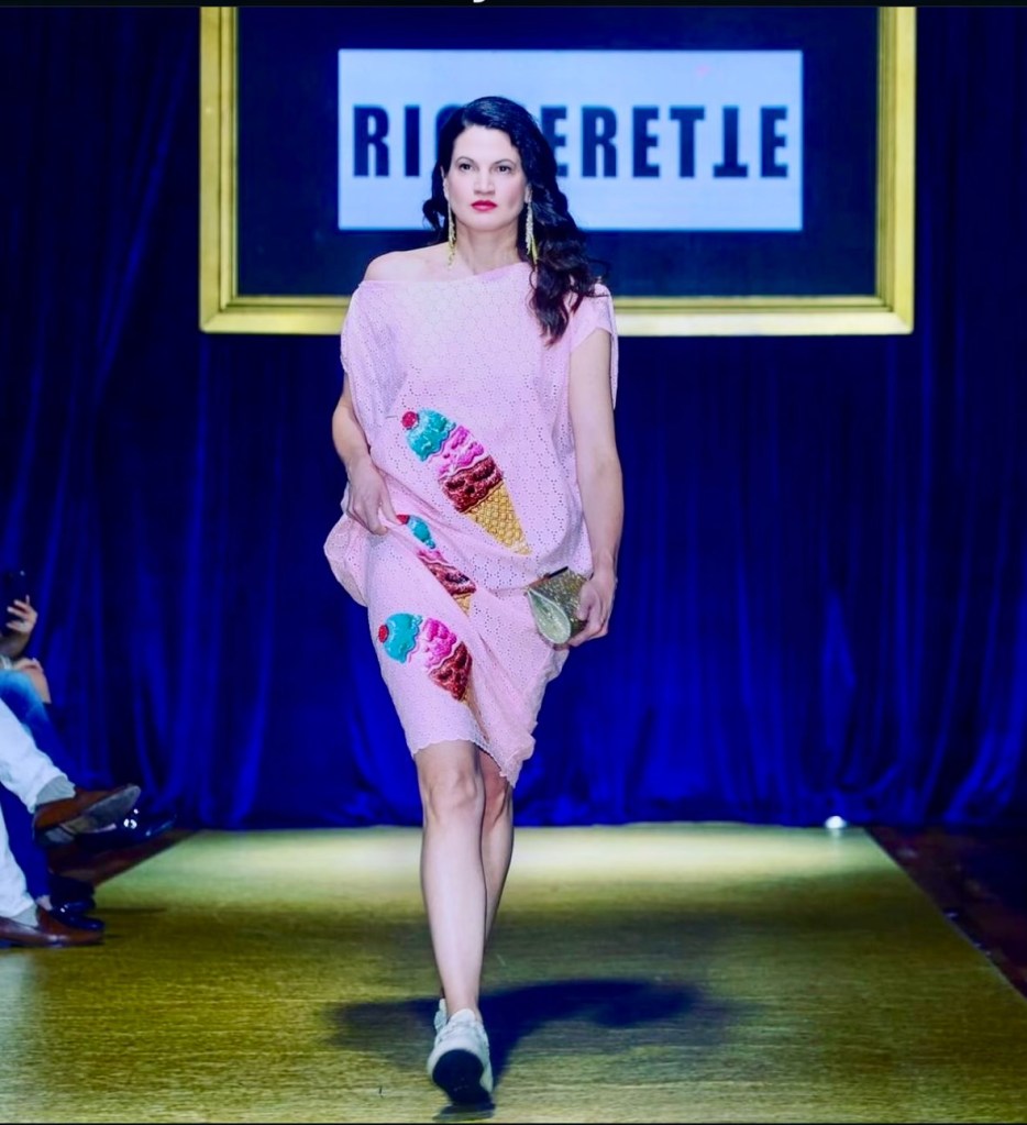 With a newfound confidence, I took myself to NY and attended my first big casting and walked for New York Fashion Week in September of 2023. My legs were shaking and my fingers cramped up before I got on the runway. When the show manager pulled back the curtain and shouted, “go!” I immediately experienced an exhilarating rush. With every step I reminded myself how awesome it was that I was walking the cat walk! My 16-year-old self would have been immensely proud, especially since I was wearing a dress with an ice cream cone on it! (Richerette By Richie Rich show)